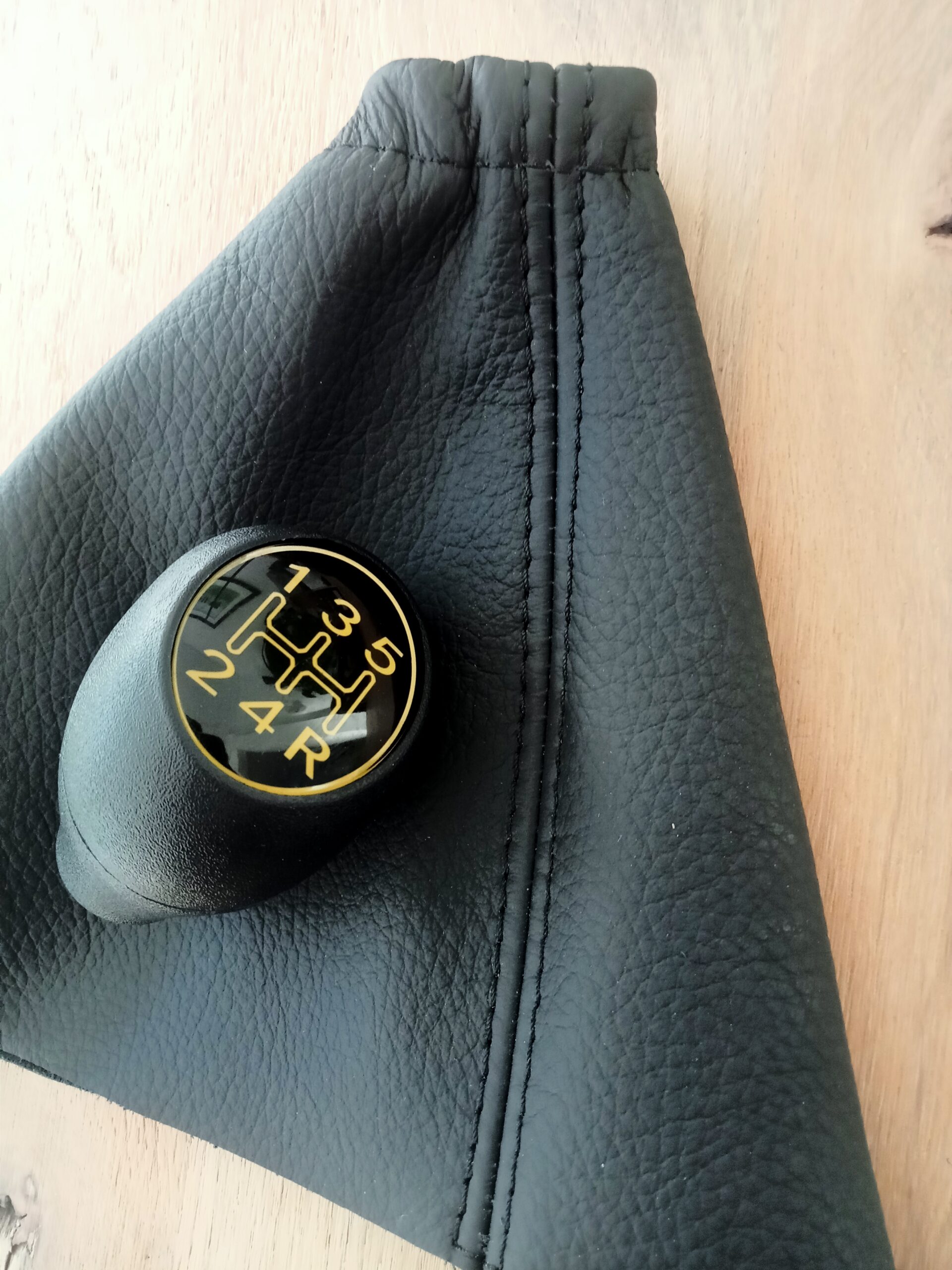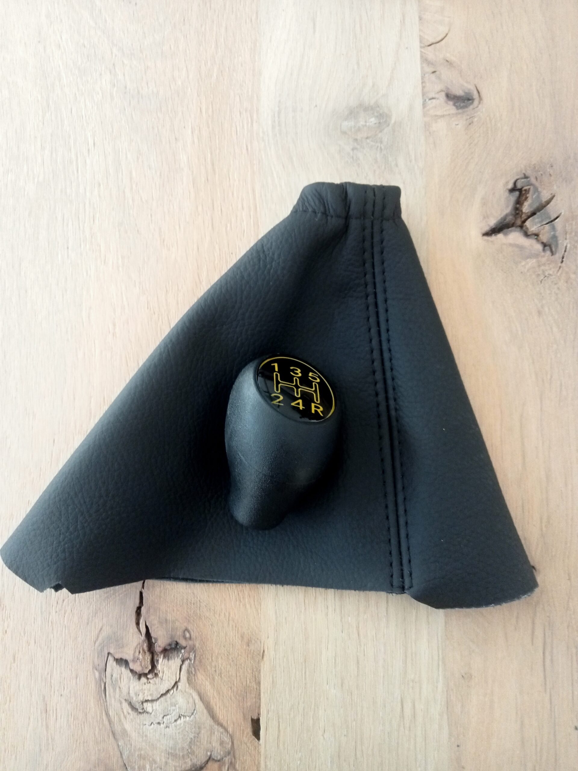Nieuwe echt lederen pookhoes met zwart stiksel + pookknop met gele inleg voor de Peugeot 205 phase 2.