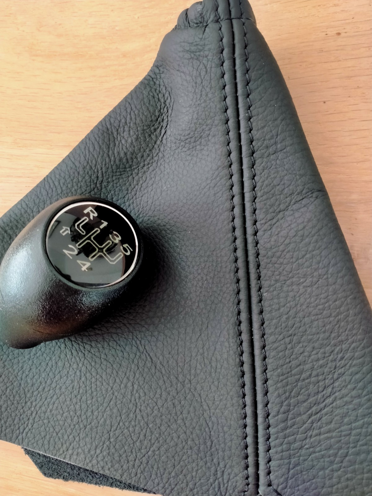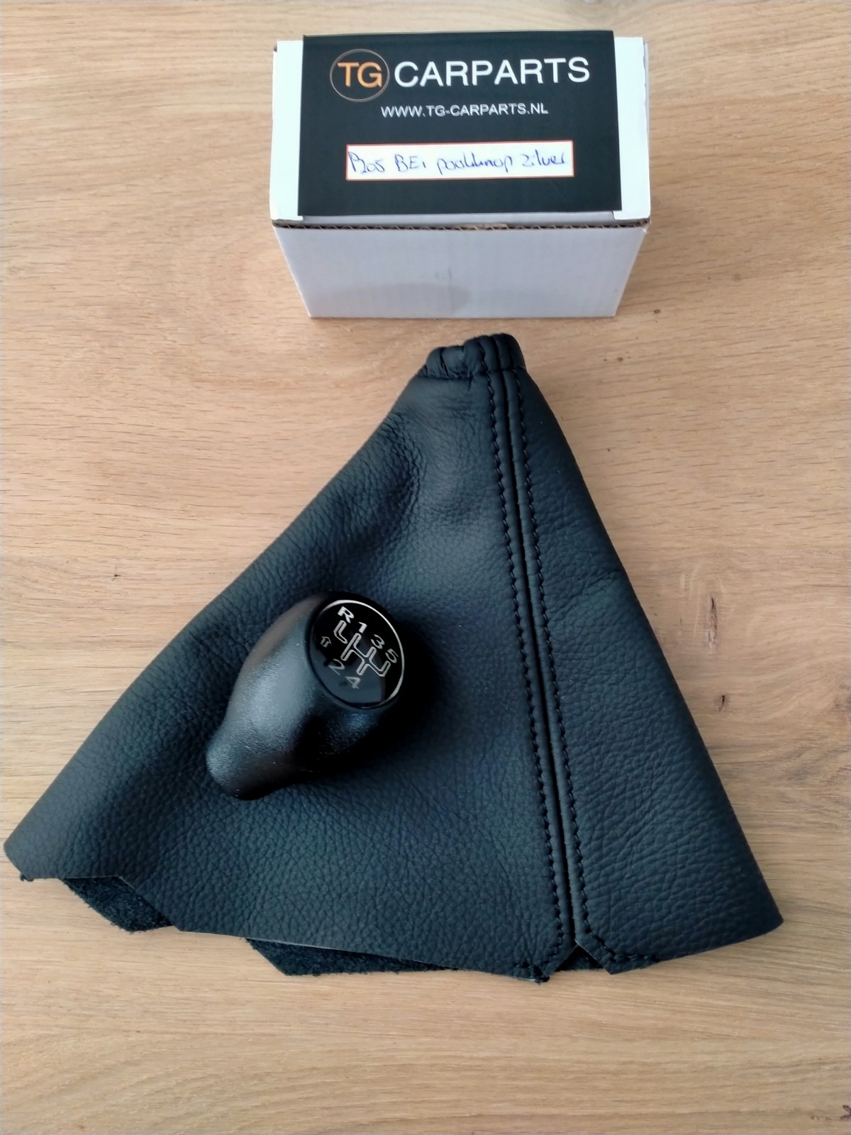 Nieuwe echt lederen pookhoes met zwart stiksel + pookknop (BE1) met zilveren inleg voor de Peugeot 205 phase 1.